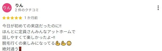 サロンをご利用いただいたお客様からの嬉しいお声をご紹介いたします。「最初から最後まで居心地が良かった」「効果を実感しているので通い続けたい」など、多くのお客様にお喜びの声を頂戴しています。サロン選びに悩まれている方や初めての方の参考にもしていただける内容です。ぜひご覧ください。お客様からのお声を励みに、気軽に通えるサロンを目指してまいります。